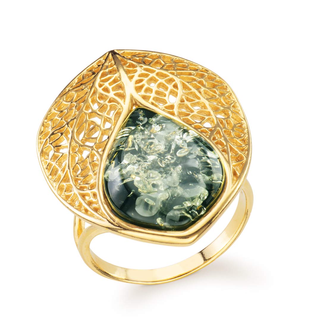Eden Leaf Vein Lattice Harmony Baltic Green Amber Ring